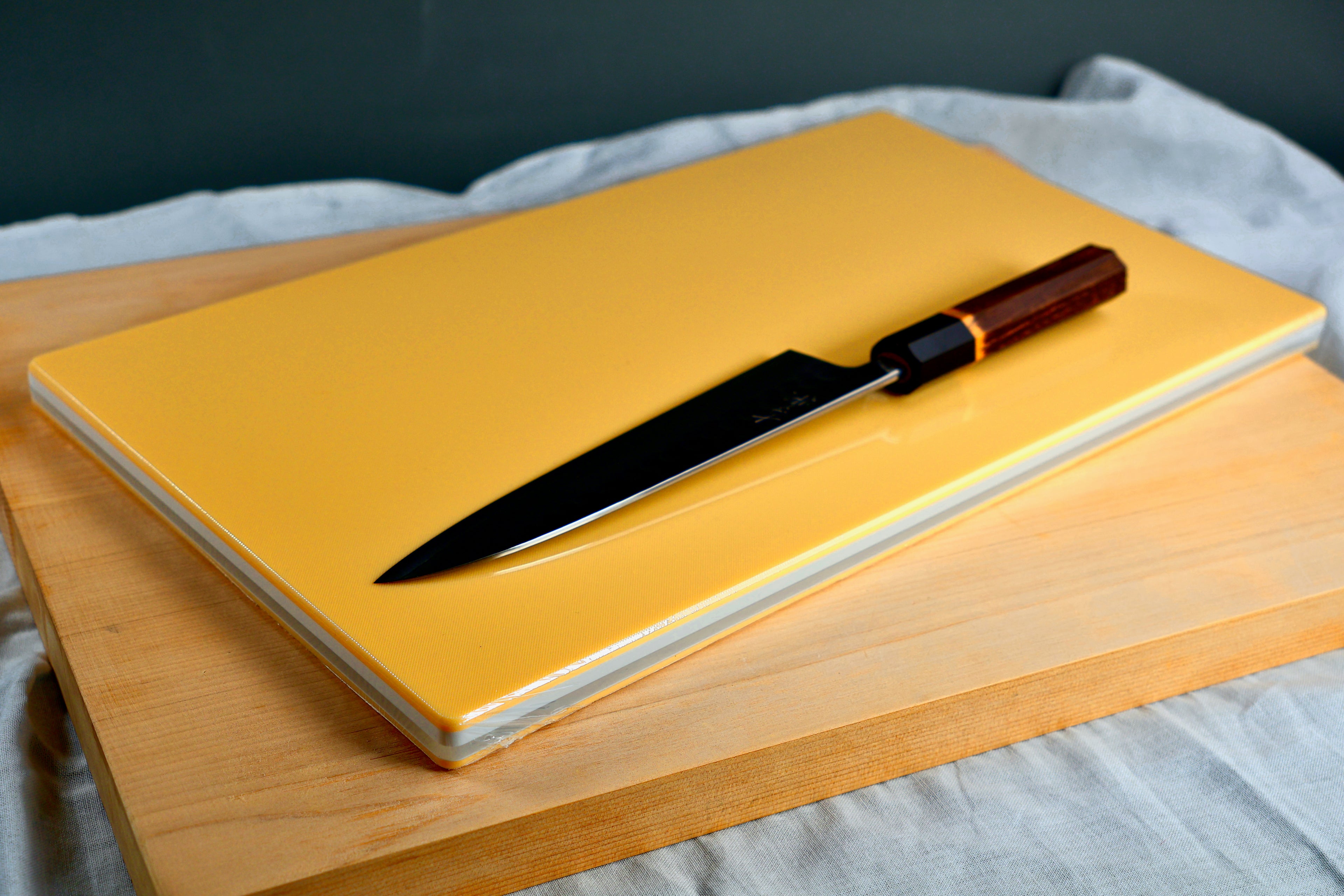 Hasegawa cutting boards feature a premium soft cutting surface and sturdy wood core, surrounded by synthetic rubber. The wood core keeps the overall weight low and maintains a flat surface. The build quality is excellent.