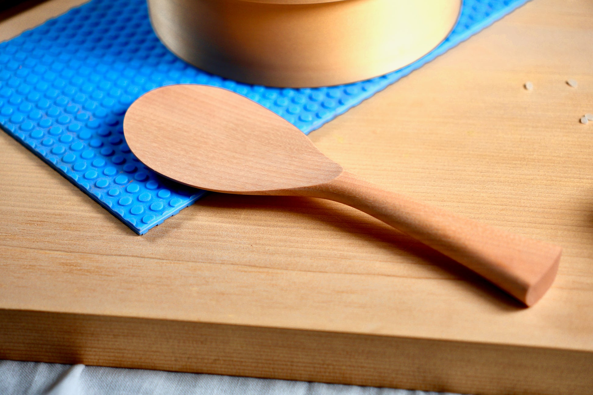 The rice paddle is made from catalpa, which is a softer wood that's popular for furniture making. It's easy to work with and stands out with its attractive color and tone.