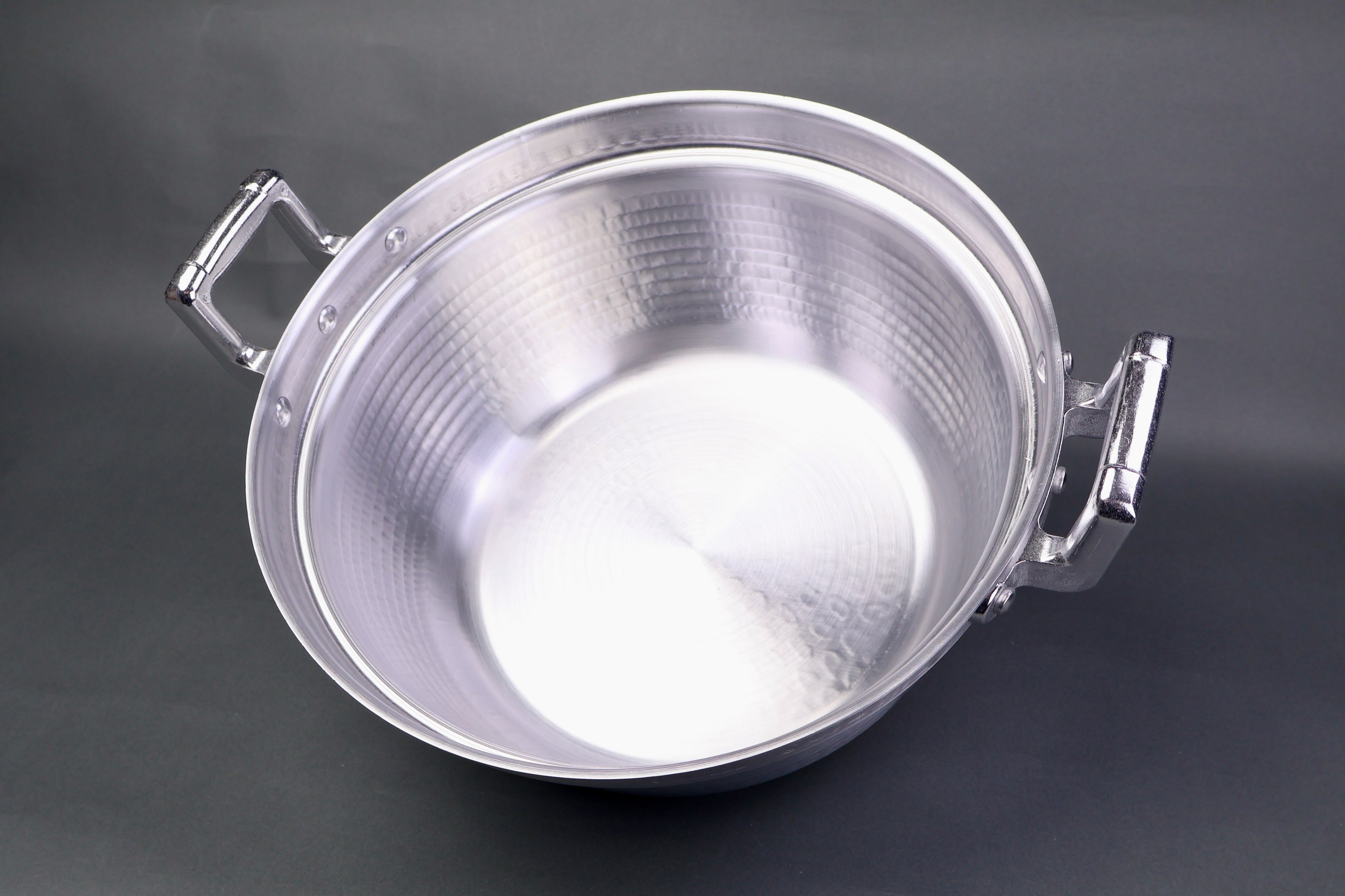 Uniquely shaped, 2 handled aluminum steam pot. Ideal w/ steamer inserts and for cooking nimono.