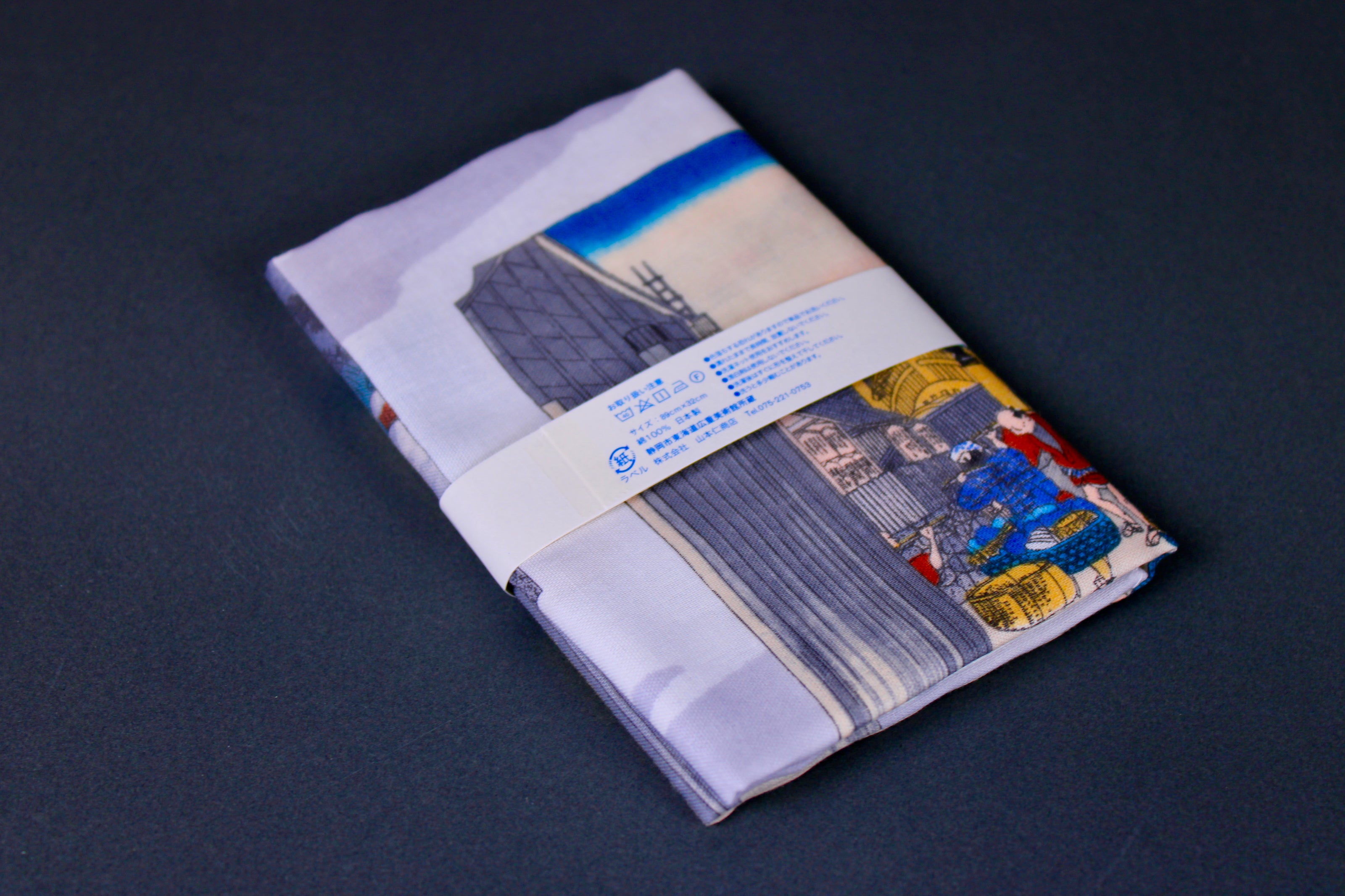 Ukiyo-e, specifically woodblock prints from the Edo period and later, have a traditional and timeless visual appeal. The woodblock printing techniques, colors, and characters are combined here with Japan's long history of tenugui towel manufacturing.