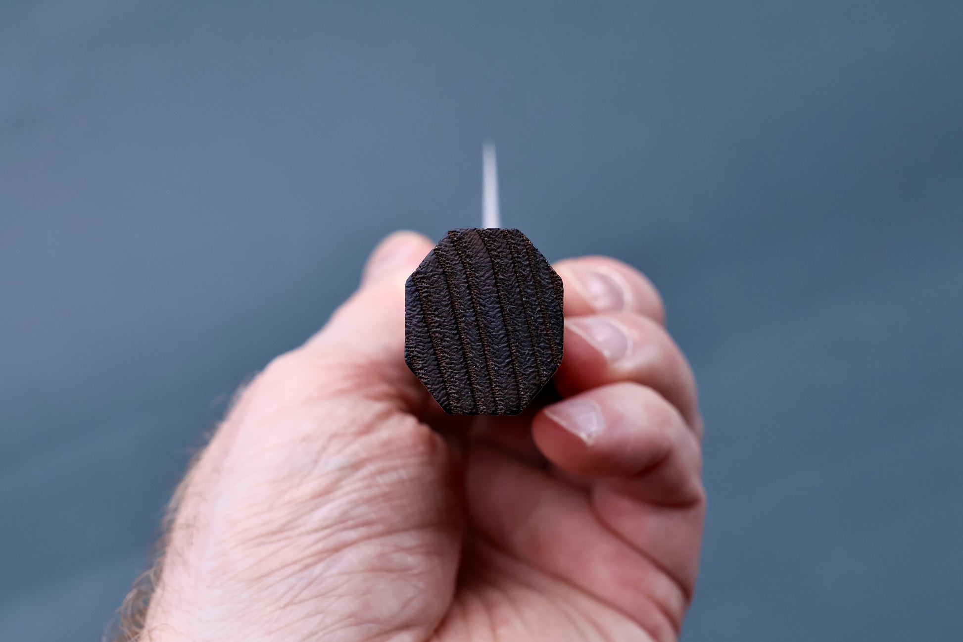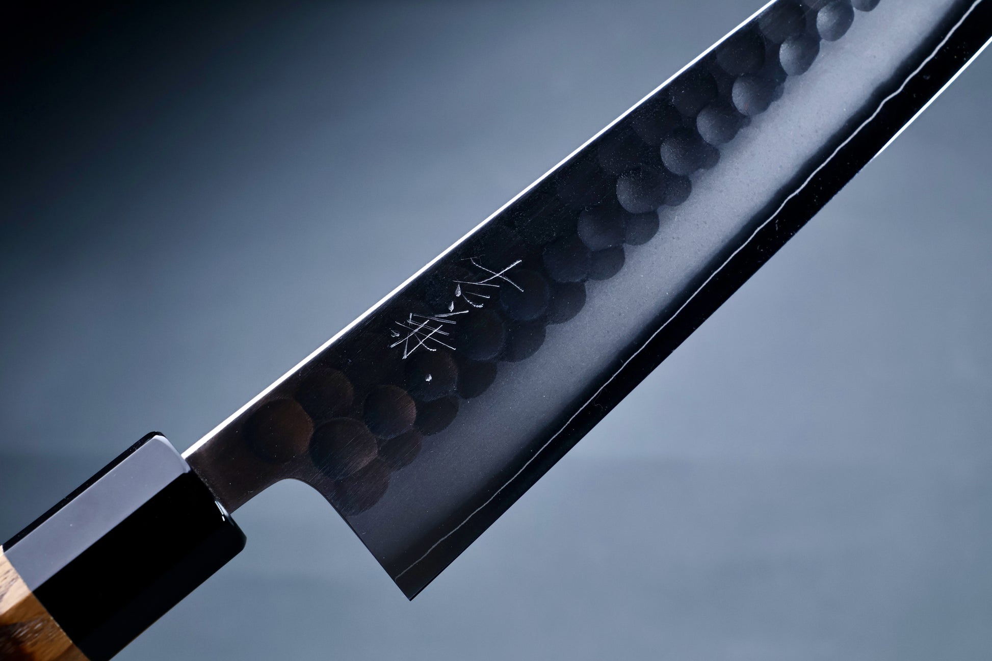 Tsuchime is the hammered, dimpled surface of the upper portion of the knife. This is a traditional Japanese metalworking technique that is both functional and aesthetic. The hammered surface is said to prevent food from sticking and improve cutting performance.