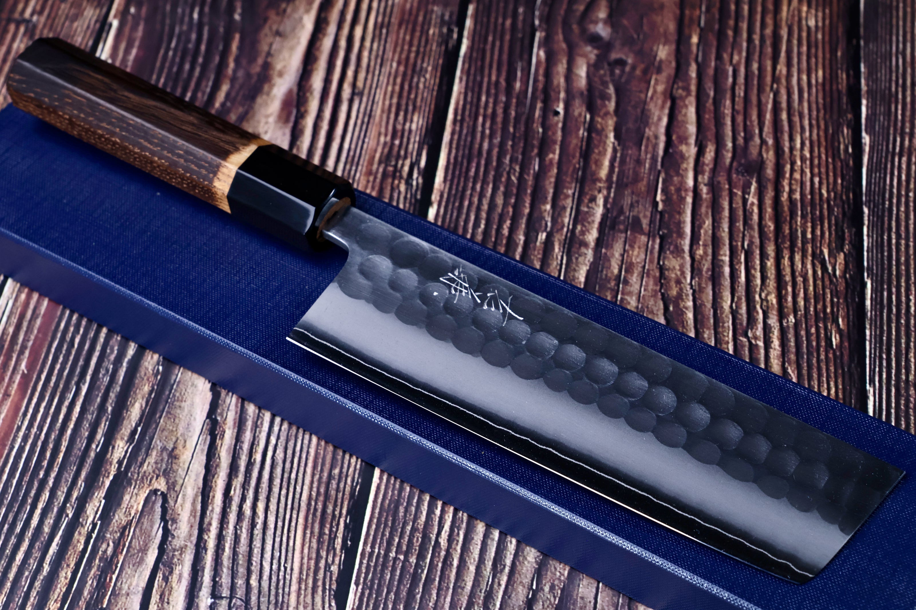Classic tsuchime hammered surface, Exceedingly high quality SKD steel, ergonomic & aesthetic burnt chestnut handle. A shop favorite. Highly recommended.