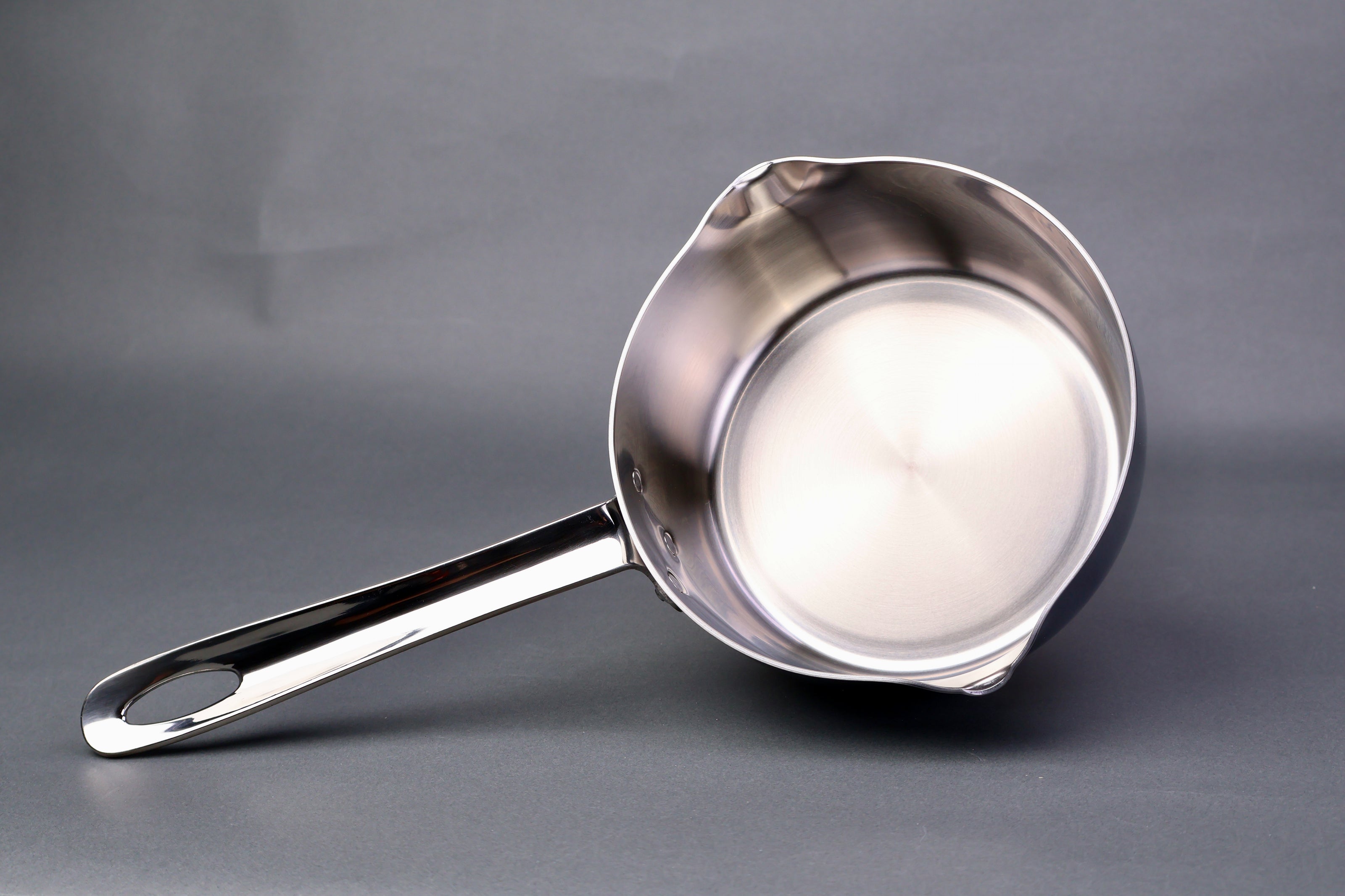 High quality 3-layer stainless steel yukihira saucepan, classic wide bottom and dual curved beak design.